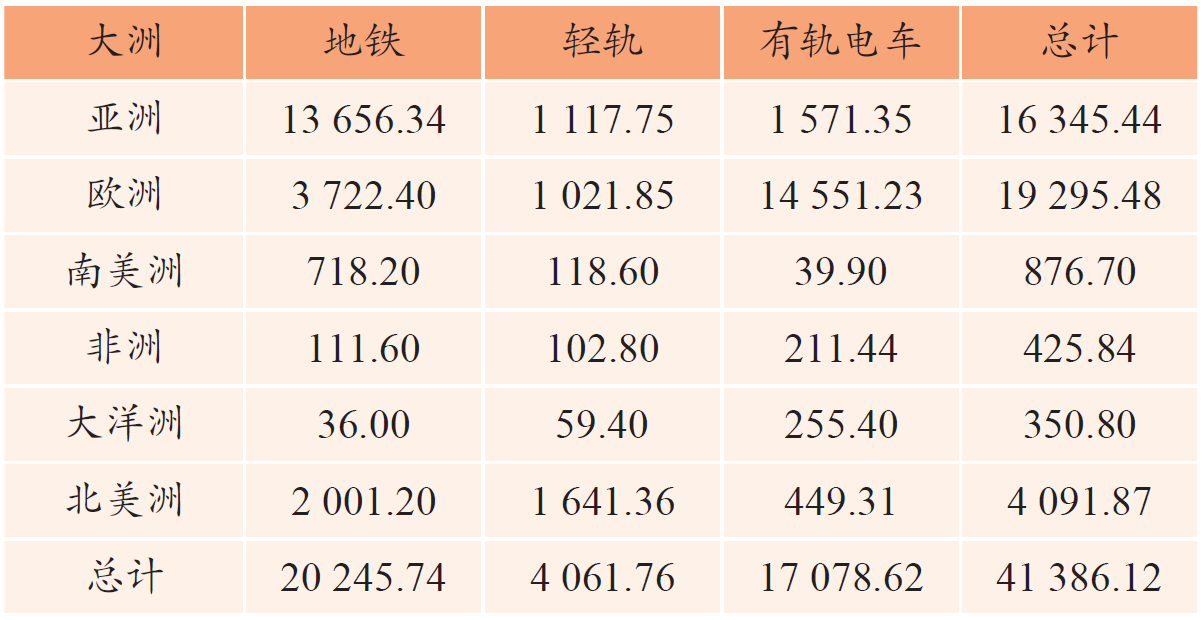 شکل 1 مقیاس کلی ترانزیت ریلی شهری را در قاره های اصلی جهان نشان می دهد (توجه: تمام شهرهای روسیه برای محاسبه در اروپا طبقه بندی می شوند). داده ها نشان می دهد که مترو و تراموا انواع اصلی ترانزیت ریلی شهری در سطح جهان هستند، و حمل و نقل ریلی شهری جهانی عمدتاً در اوراسیا متمرکز است و متروها عمدتاً در کشورهای آسیایی توزیع شده اند.[1]
