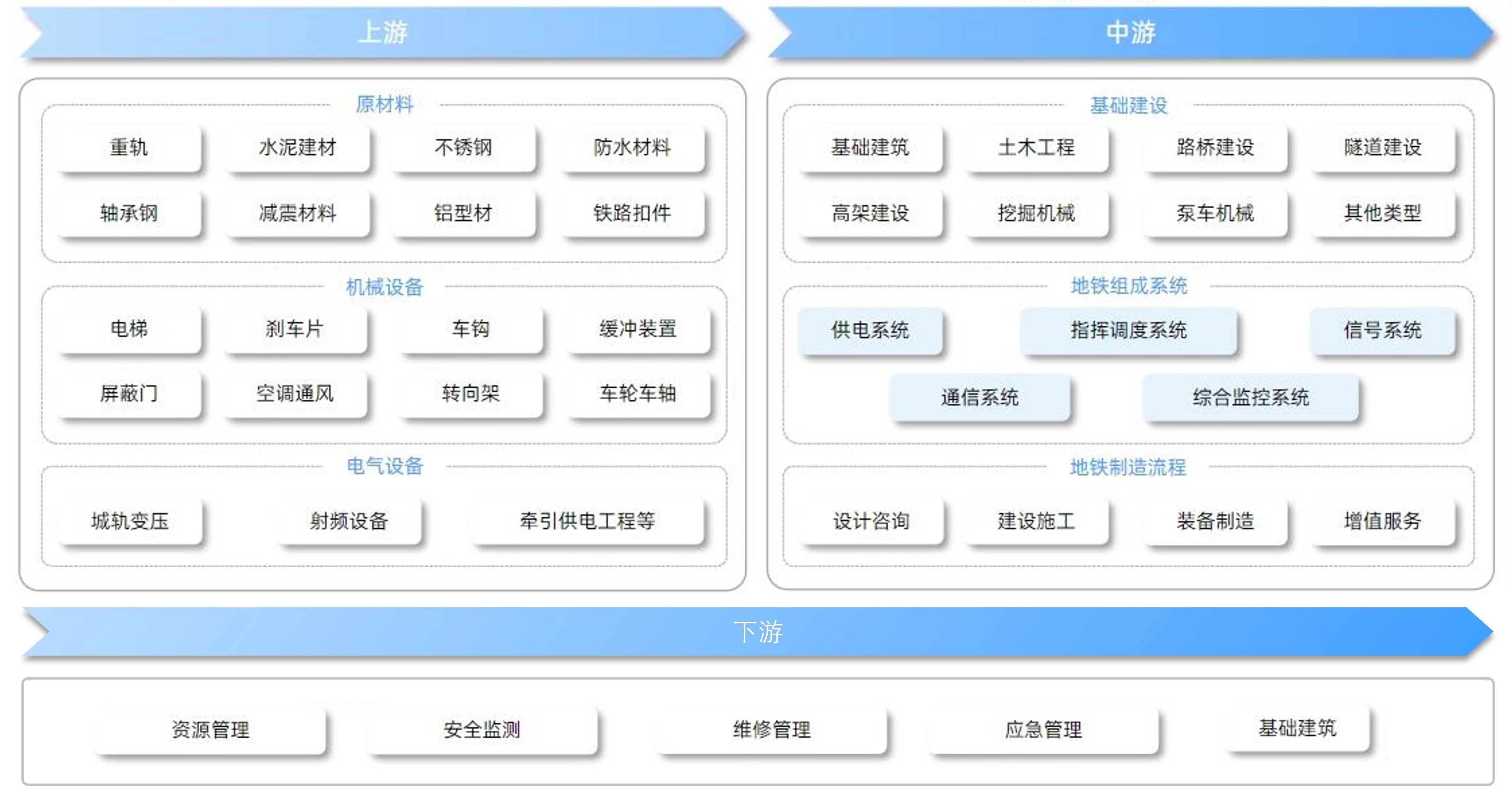 ترانزیت ریلی صنایع شهری را به هم متصل می کند، گسترش زنجیره صنعتی را ترویج می کند و توسعه سریع صنایع حمایت کننده مانند تولید تجهیزات و تحقیق و توسعه فناوری را پیش می برد. زنجیره صنعت مترو در شکل 3 نشان داده شده است، که در آن همه پیوندها به یکدیگر وابسته هستند و توسعه اقتصادی تراکمهای شهری و مناطق شهری را هدایت میکنند.[2]