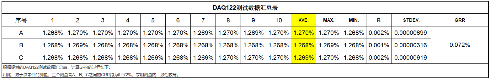 تیم ME برای اطمینان از اینکه کارت اکتساب داده انتخابی با الزامات مطابقت دارد، آن را آزمایش کرد. تجزیه و تحلیل نشان میدهد که کارت جمعآوری داده انتخابشده دارای ثبات عالی است، با GRR تقریباً ۰.۰۷۲ درصد در بین سه اندازهگیر A، B و C.