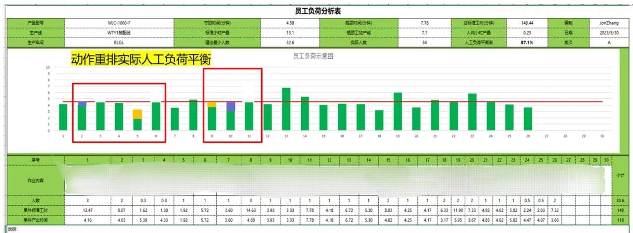 میزان بار کاری کارکنان یک عنصر اساسی در بهبود ظرفیت است. به دلیل زمانهای چرخه ناسازگار بین فرآیندها، خروجی واقعی نسبتاً کم بود. بخش ME با بهره گیری از تجربه انباشته شده از بهبودهای قبلی تعادل خط، رهبری ابتکارات را برای افزایش نرخ تعادل بار کاری کارکنان خط تولید به عهده گرفت. با استفاده از اصل ECRS (حذف، ترکیب، تنظیم مجدد، ساده سازی) برای بهینه سازی فرآیندها، نرخ تعادل بار کار کارکنان به بیش از 82 درصد رسید.