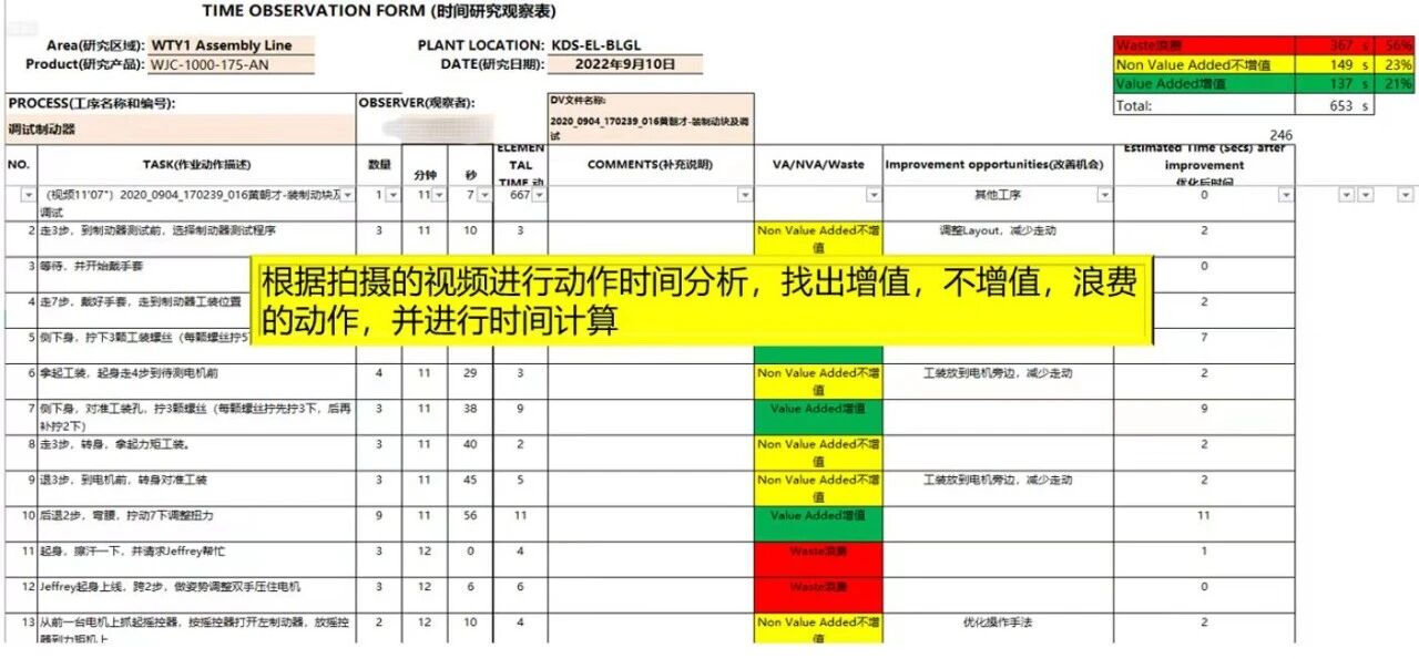 به عنوان اولین ابزار بهبود سیستماتیک که در داخل معرفی شده است، تجزیه و تحلیل زمان تجربه بهبود قابل قبولی را جمع آوری کرده است. همچنین نقش پیشگامی در درایو بهبود کلی VSM ایفا کرد - هم به عنوان ادامه پیشرفت های قبلی و هم پیوندی به پیشرفت های بعدی پروژه خاص. تیم های بهبود، پرسنل اختصاصی را برای فیلمبرداری از عملیات کارمندان در هر فرآیند مطابق با اصول ساعت کاری استاندارد تعیین کردند. اعضای تیم و حتی کارمندان خط مقدم به طور مشترک ویدئوها را به طور مکرر بررسی کردند، حرکات کاری را تجزیه و تحلیل کردند، و برای شناسایی فرصتهای بهبود و ارائه پیشنهادات، طوفان فکری جمعی انجام دادند و در نهایت یک برنامه بهبود را تدوین کردند.