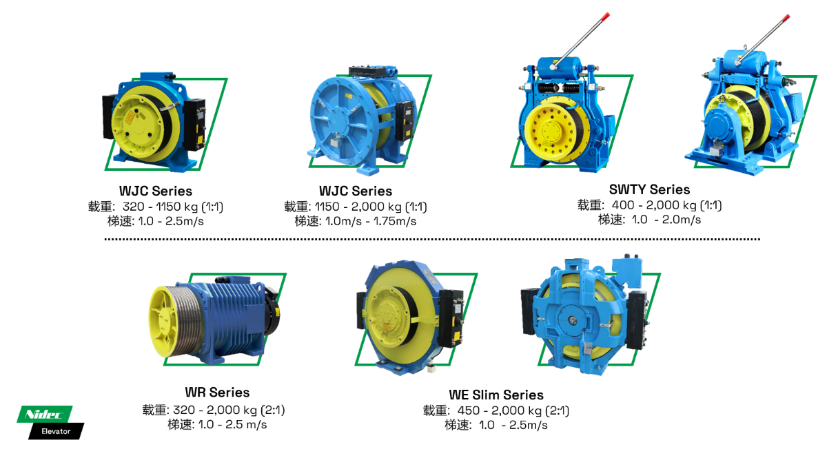 • با حداکثر ظرفیت بار تا 5500 کیلوگرم و حداکثر سرعت آسانسور 3 متر بر ثانیه، طرح های مختلف نسبت کشش نیازهای بار از 2500 کیلوگرم تا 5500 کیلوگرم را پوشش می دهند.